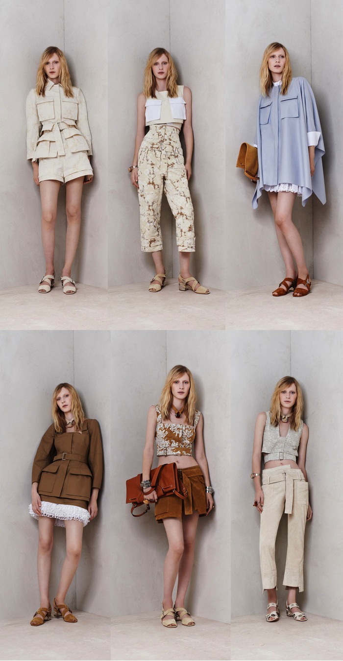 A good deviation from frilly and poofy, Burton's resort collection for McQueen was relaxed and chill in all the right ways. The big boxy pockets with flaps looked so good on the outerwear, blouses, and bottoms (I am in LOVE with those dark camel suede? shorts). I got a lot of casual "safari" vibes (in a fabulous way) from the earthy toned pieces. Again, those crop tops making me want to sport them all summer...